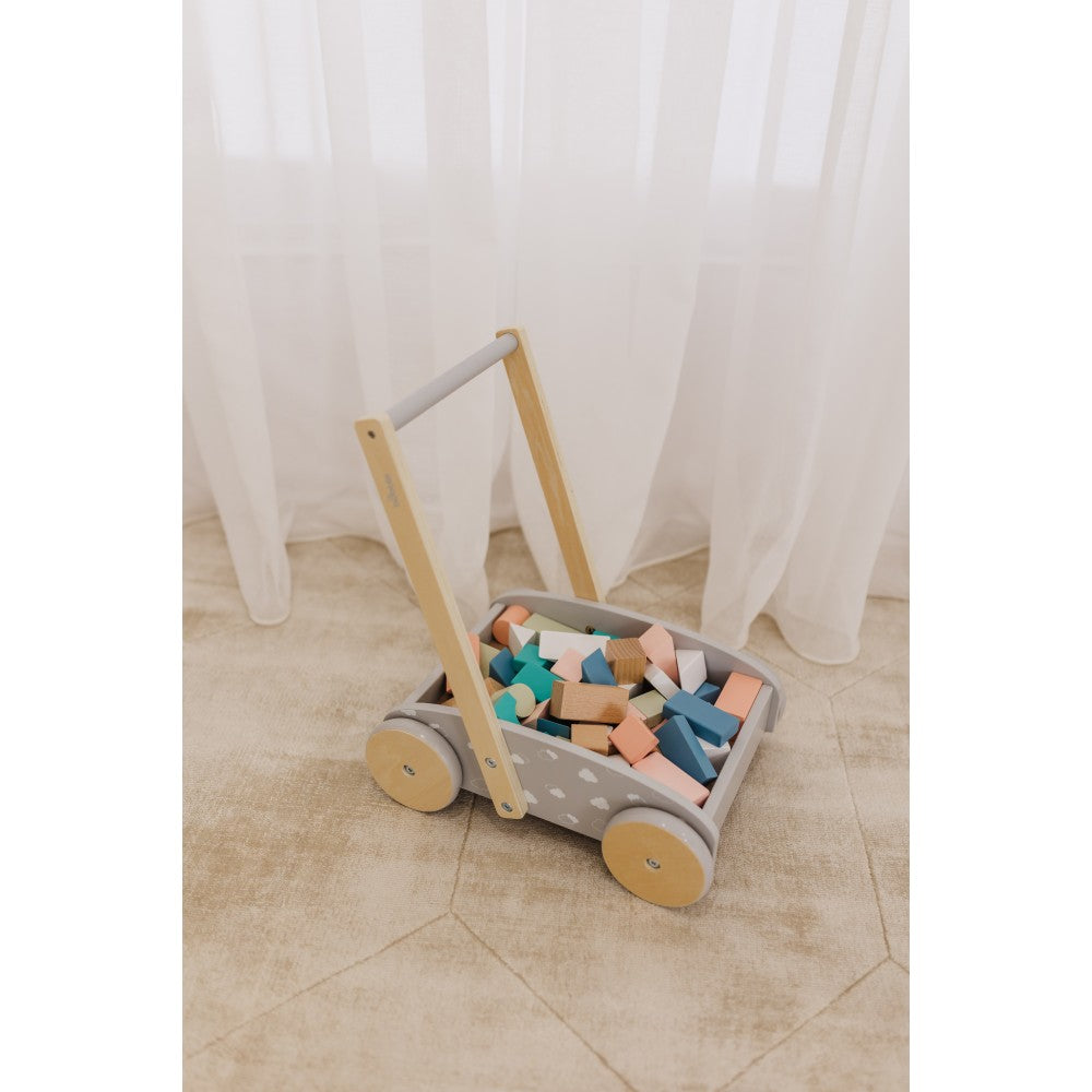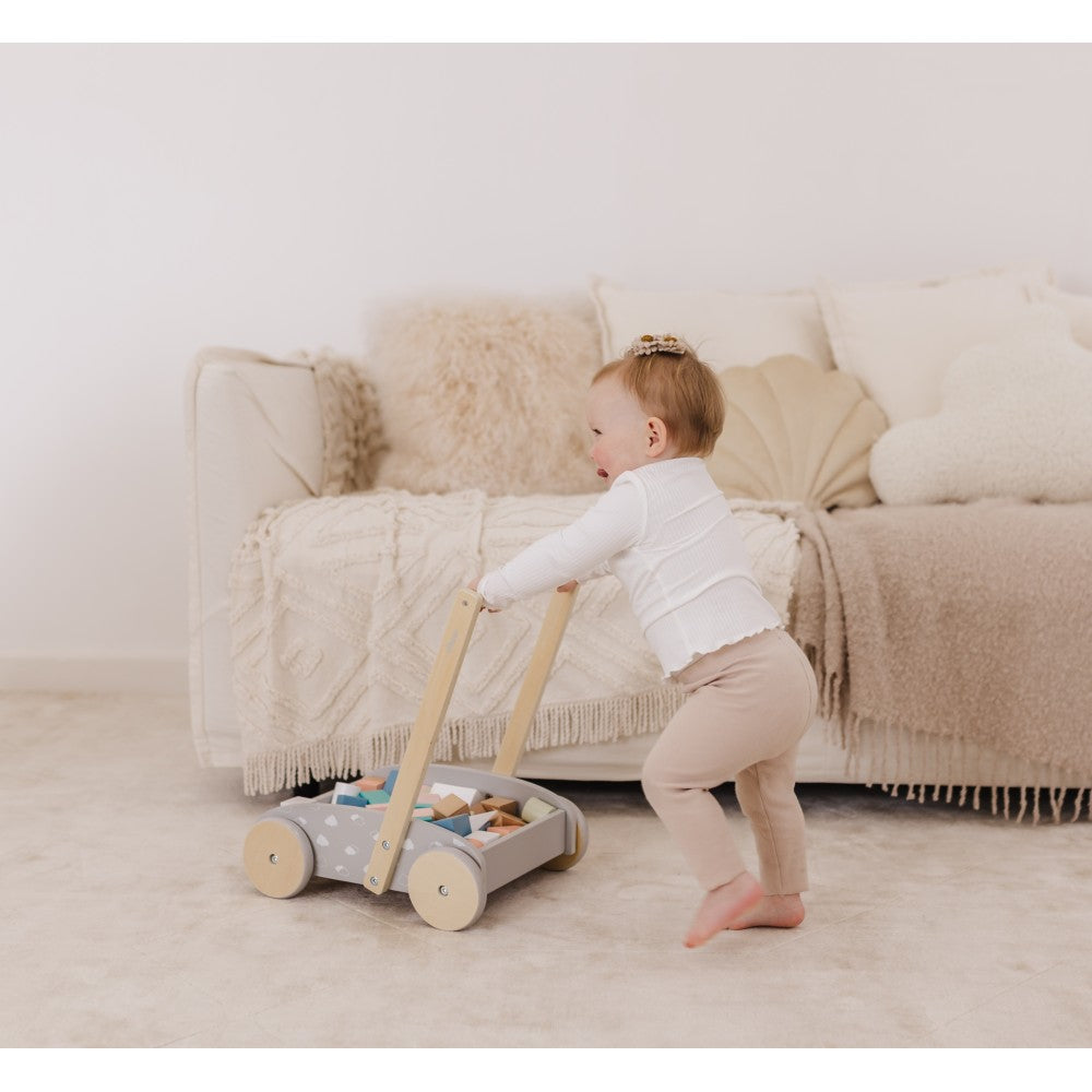 The Bubble Wooden Push Cart & walker is a traditional toy with a modern look! The sturdy construction of this walker offers stability for your toddler learning to walk, while the easy-grip handle is angled to avoid it tipping!