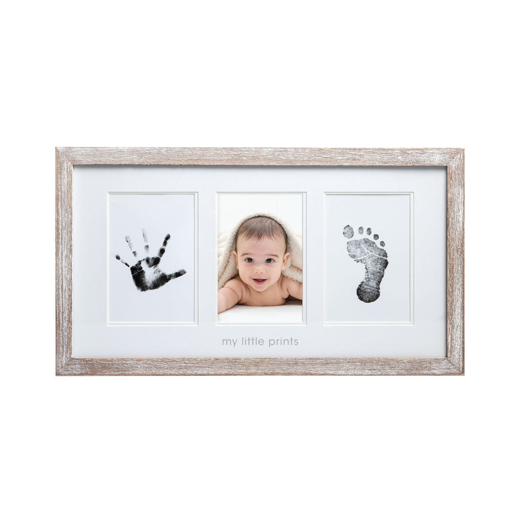 - This baby handprint and footprint frame features an inkpad kit to capture your baby’s handprint or baby’s footprint. The sturdy baby frame also boasts a neutral color and silver lettering that reads, “my little prints.” Display the baby decoration with your baby’s tiny prints as part of your nursery décor, baby shower décor, or use the baby frame as an infant keepsake